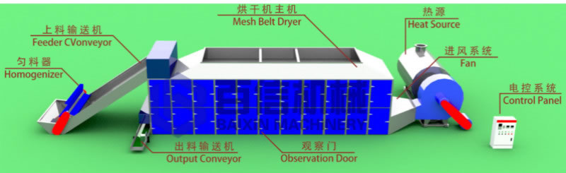 辣椒烘干機也是多層帶式辣椒烘干設備主要是有:上料系統(tǒng)、烘干系統(tǒng)、加熱系統(tǒng)、出料系統(tǒng)組成,分別包括上料輸送機,均料器,烘干主機,出料輸送機、大風機、小風機、熱源,傳動機和控制柜。